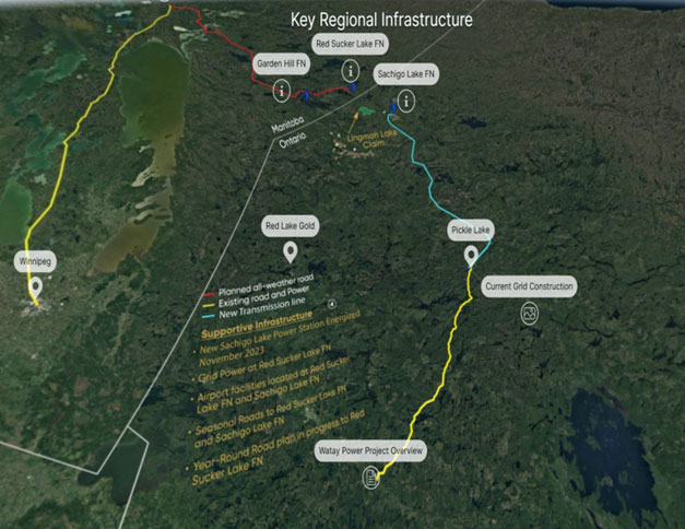 Planning for the Wataynikaneyap Power Project project began in 2008 with the original Central Corridor Energy Group targeting the connection of 13 First Nations communities. In 2014, it expanded by five the number of communities it was targeting to connect to the grid and in 2016 the list of communities to be included in the program was expanded to 22 communities. In November 2023, Sachigo Lake First Nation, 40km to our west was connected to the power grid with a 115kV high tension transmission line and a substation. More on the Watay Power Project can be found here. On the Manitoba side, the provincial government has been planning an all season road connecting the northern First Nations communities including the Red Sucker Lake First Nations community. A majority of our supplies are flown out of Red Sucker Lake to the exploration camp at Lingman Lake.