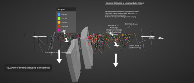 In 2024 the company’s drill program focused on necessary data collection to complete the initial mineral resource estimate. The program was very successful and allowed for the completion of updating the geologic models and producing the initial resource model for the Lingman Lake Gold project. With the NI 43-101 completed, we can turn our to attention to expanding the resource. Lingman Lake is in the Red Lake district of Ontario where most mines have deposits extending at depth. The work at the Lingman Lake deposit is still relatively shallow as can be seen in the view of the historical drilling results compiled for the initial resource estimate.
