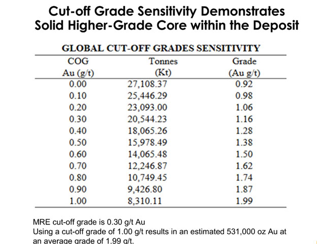 When looking at the sensitivity to cut-off grade, the significant amount of higher grade material near surface supports a notable 531,000 ounces at an average grade of 1.99 g/t when the cut-off grade is increased to 1.00 g/t which makes for a nice starter-pit scenario when contemplating mine construction.
