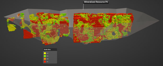 The graphic below shows the modeled blocks of the mineral resource estimate based upon grade bins. The mineralized blocks at the 1.0 g/t cut-off grade are represented in red. In addition, you can see a number of mineralized blocks outside the conceptual pit shell that can be captured as the pit shell is expanded.